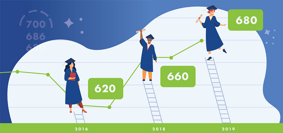 On average, students have experienced a 60-point increase in credit scores from 2016 to 2019. This boost comes after a short period of declining scores for students from 2014 to 2016.